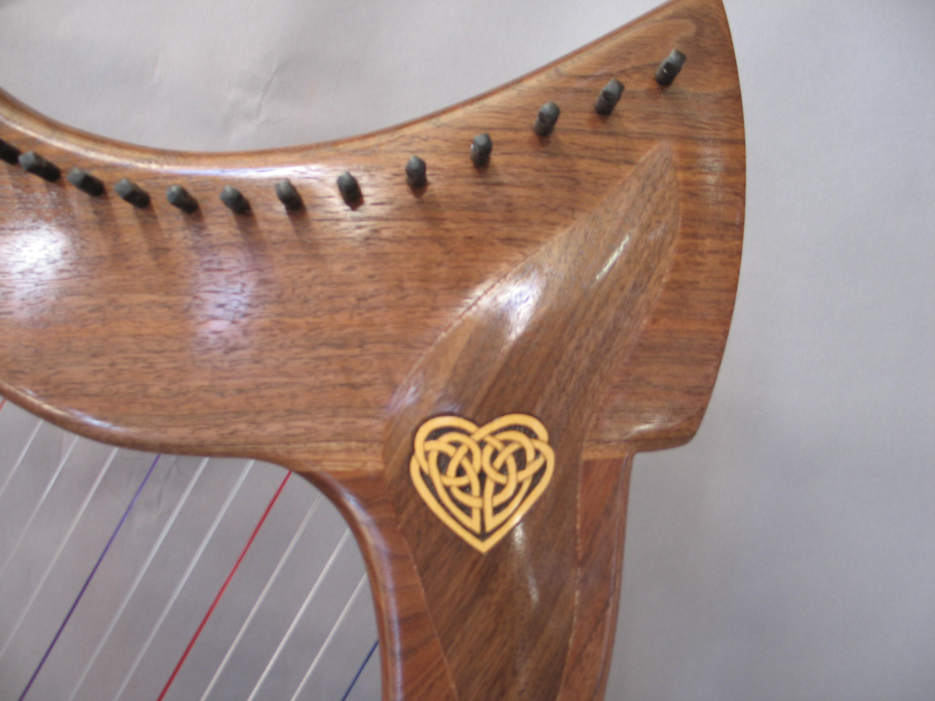 Celtic knotwork heart carved and inlain into a custom Raphael26 Claro Walnut Therapy harp. Made of Boxwood