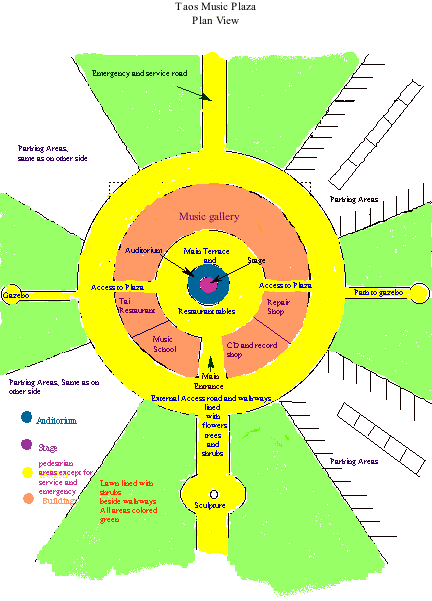 This outline presents an integrated concept for a music plaza to serve the needs of Taos and Taos County residents and provide a new hub for activities all focussed on the central theme of music. Music is an integrative medium. It brings people together. It takes people into a landscape that is beyond words and difference. It binds and it enriches the heart. Taos is a unique artistic milieu consisting of at least three rich cultural environments. It is also one of the poorest economical regions of the USA, depending, to a large extent, on the tourist industry for its economic survival. The foundation of this concept of a music plaza is that it provides an integrated cultural and financial dynamic for the local population, not dependent on the tourist industry, while it serves the tourist population at the same time. It will even draw tourists to Taos.
